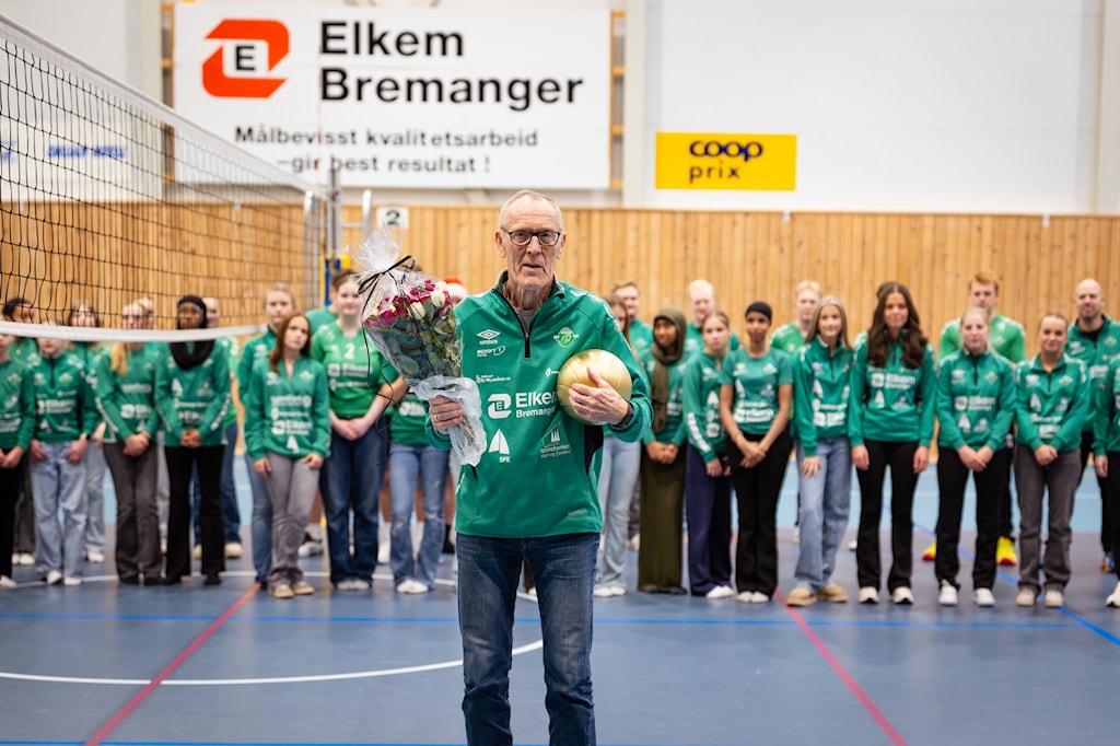 Forsidebilde til Årsmeldinga i STIF viser Arne Loftheim framfor medlemmar i STIF Volleyballgruppa under 50 års jubileet til volleyballgruppa 3. desember 2025. Arne var eldsjela som starta opp gruppa i 1975.
